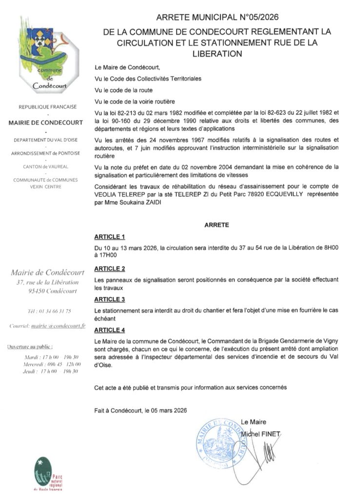 En raison de travaux de réhabilitation du réseaux d’assainissement, la circulation sera interdite du 37 au 54 de la rue de la Libération du 10 au 13 mars 2026 de 8h à 17h.