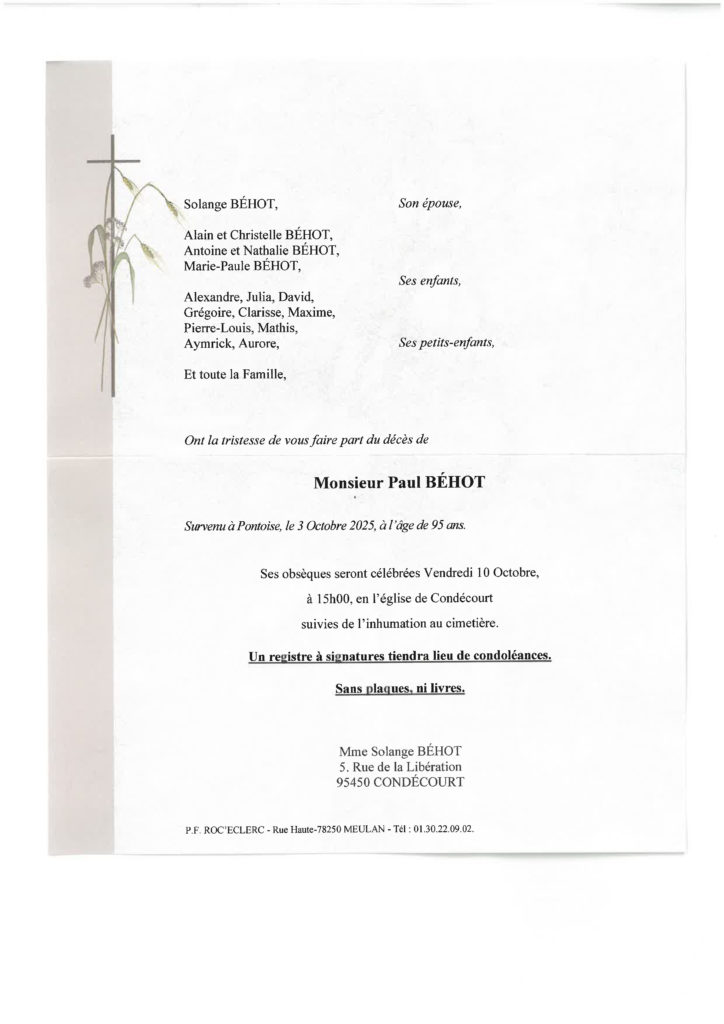 Nous avons la tristesse de vous annoncer le décès de M. Paul BEHOT le 3 octobre 2025.