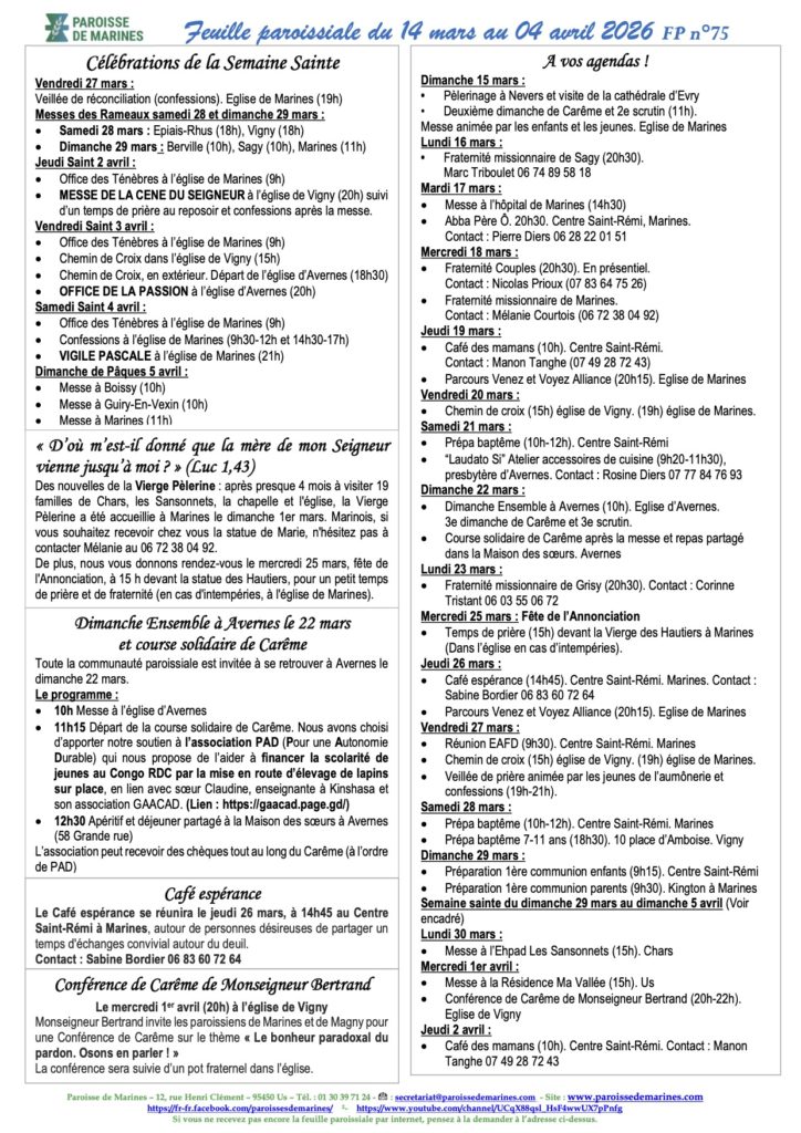 Informations de la paroisse de Marines Posted on 31 mars 2026 by Philippe DAYOT La paroisse de Marines nous informe des messes prévues pour la semaine Sainte. Feuille paroissiale