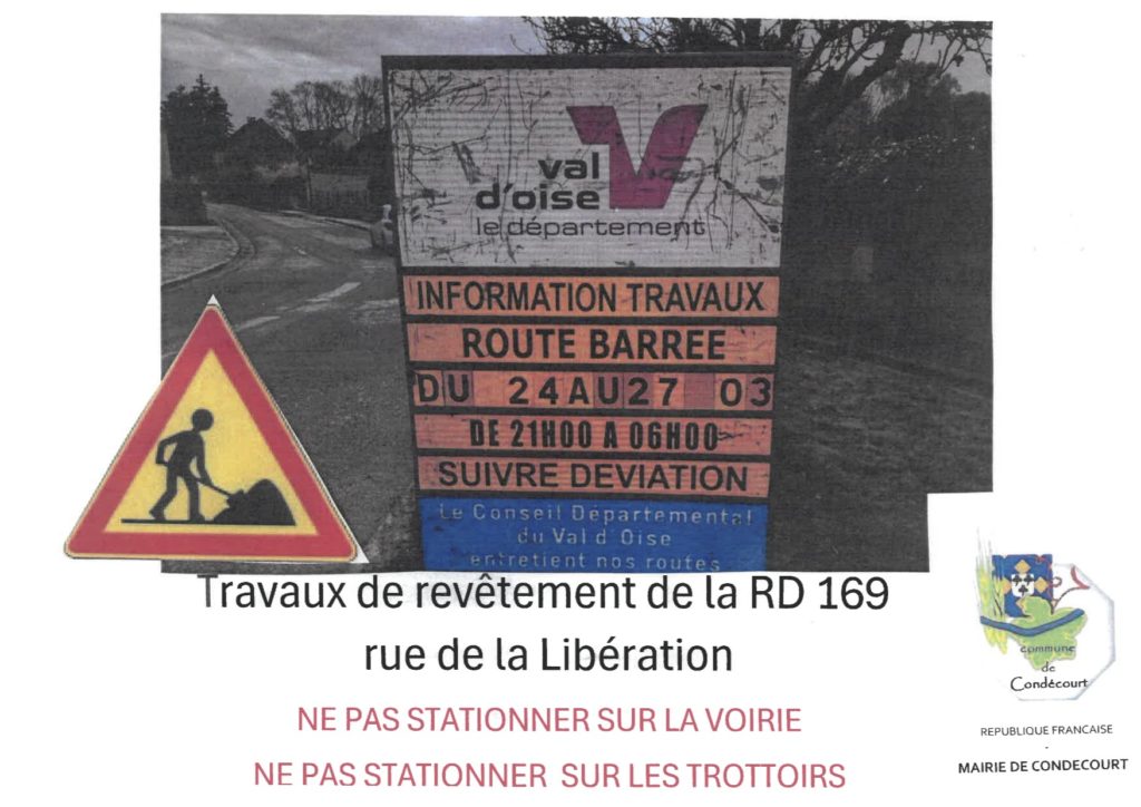 Le Conseil Départemental réalisera la réfection de la chaussée sur la rue de la Libération et la rue des Champs St Denis (RD 169) les nuits du 24 au 27 mars de 21h à 6h.